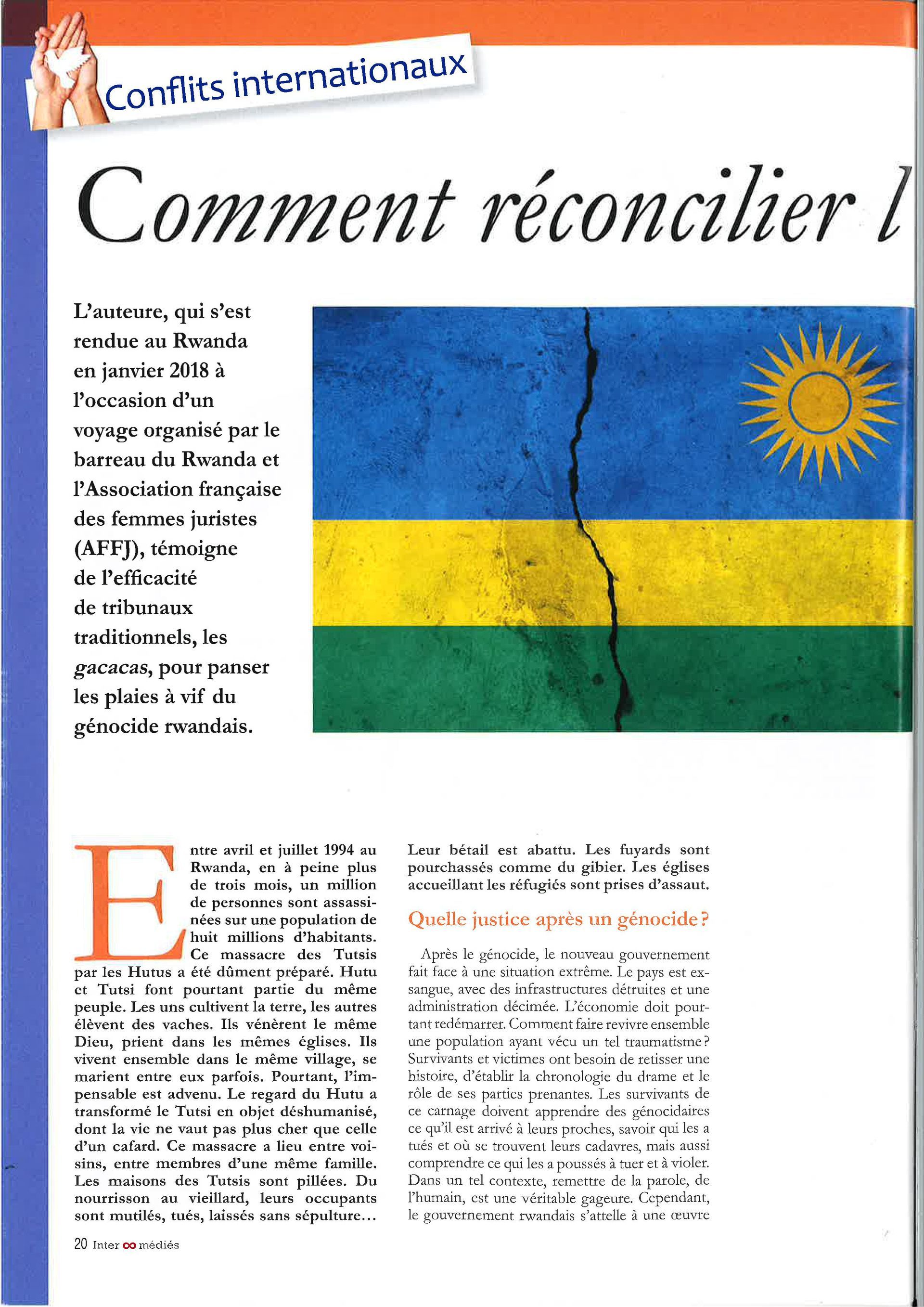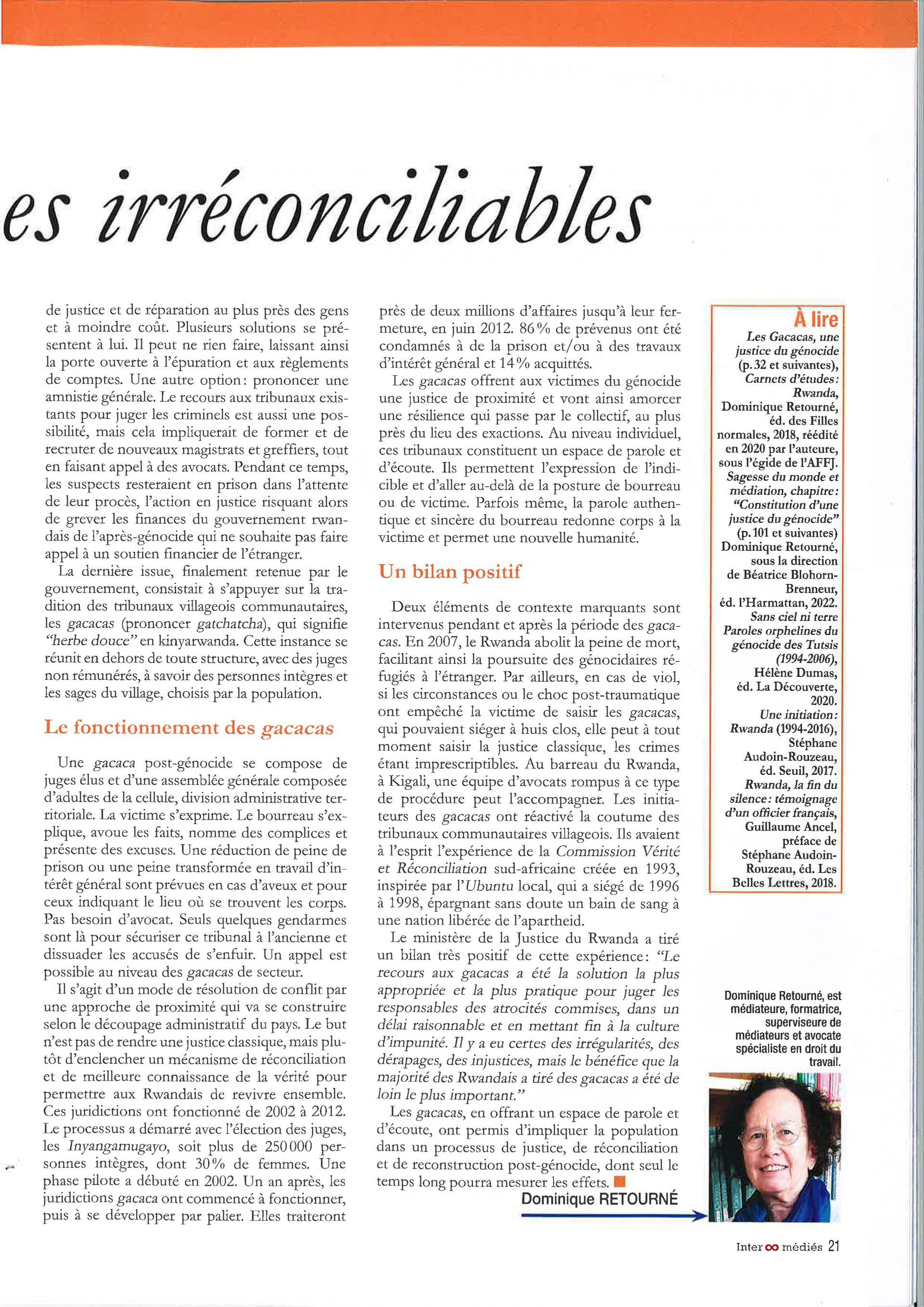 Sagesses du monde et Médiation, « Constitution d’une justice du génocide » sous la direction de Béatrice Blohorn-Brenneur aux Éditions L’Harmattan 2022 (page 101).